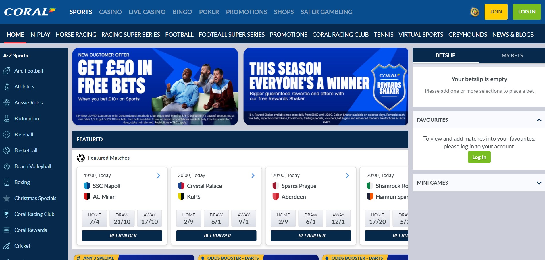 | Coral | 4.8/5 | Bet £10 Get £50 Free Bets | Broad Sports Coverage |